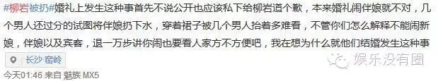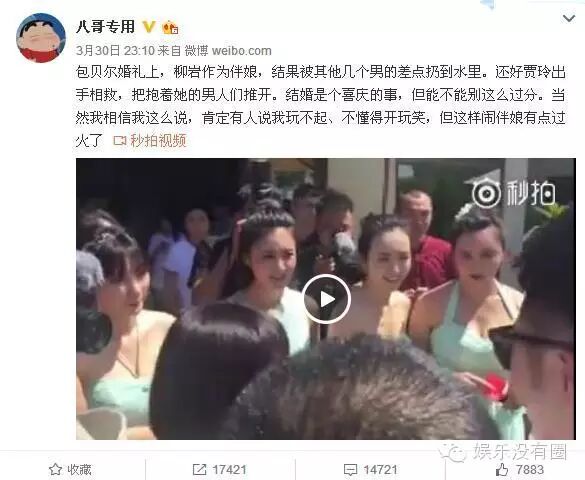 不一会功夫,该微博转发和评论均过万。就是婚礼现场伴娘柳岩被整,也就是普通老百姓婚礼中的闹伴娘,其中闹伴娘柳岩的人有新郎官包贝尔、伴郎团杜海涛、王祖蓝、曾一竣,韩庚等人。他们不顾柳岩穿裹胸裙子欲把其抬起扔到水池子里。