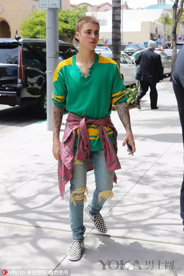 比伯的出街,红黄绿蓝黑白色再加刺青,条纹格纹外加破洞,让人好眼花缭乱!真是想穿啥穿啥,管它搭不搭!