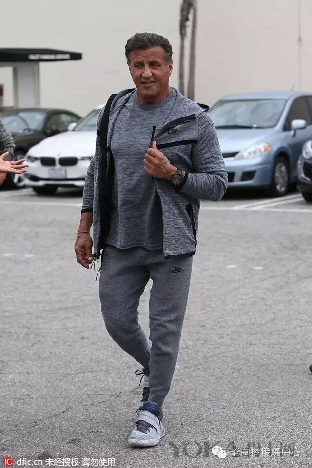 对比史泰龙之前的出街造型,这次的浅灰色运动套装就很年轻时尚,又很显自己的肌肉呢。