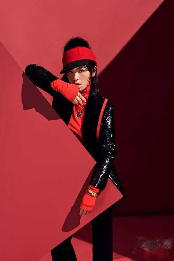 这张图倒是真的酷了!红配黑显得性感魅惑,又很有气场。手上还套了金色的手镯,更显帅气。黑色的外套在灯光下反光,十分炫酷。