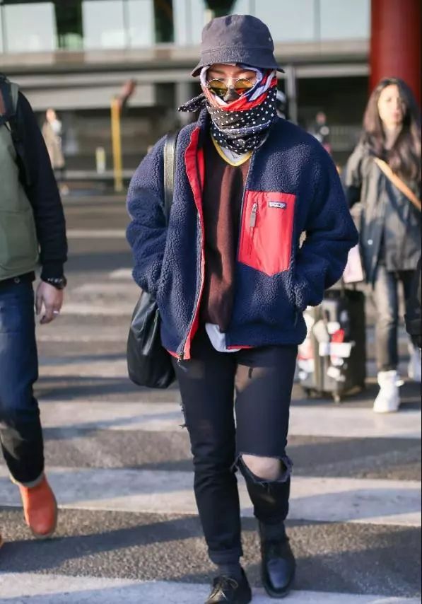 最吸睛的应该是头上和脸上了,头上戴了帽子还不够,还加了一顶盆帽,难道不会觉得重吗?而且脸上的围巾裹了不知道几层,小白点的花纹也是显得很俗气!
