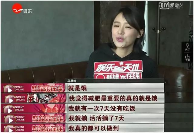 在她看来减肥最重要的就是饿,她曾经为了减肥可以做到七天不吃饭,累了就躺着。