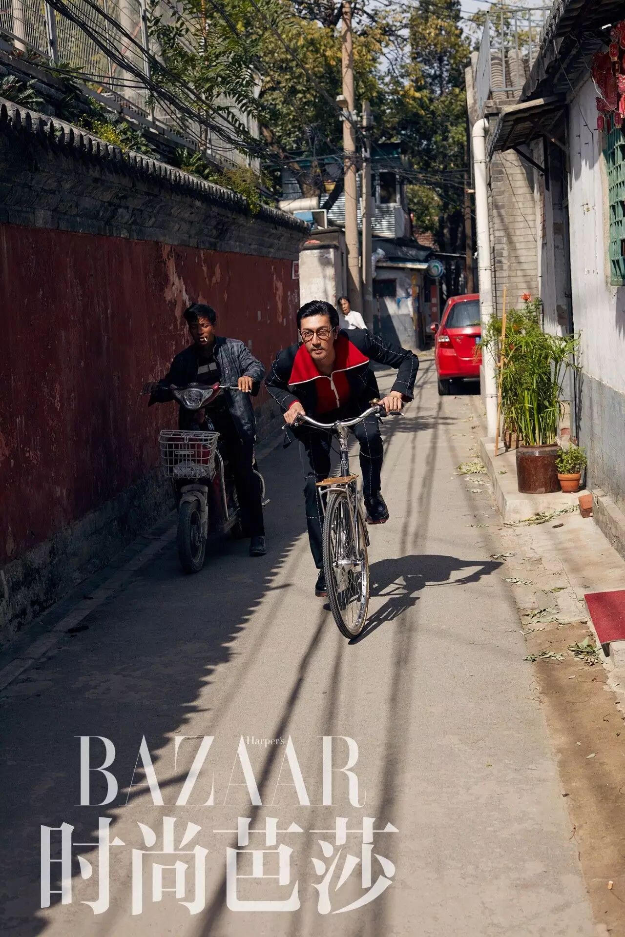 石拱门低矮,张鲁一穿过时需要稍稍低下头。穿过侧廊,走到胡同里,红墙灰瓦。他骑在一辆作为道具的自行车上,脚支着地,眼睛看向远处——远处有几个施工的工人正午休,穿着占满了灰的工装,还有牵狗遛弯儿的大妈悠闲走过来,张鲁一毫不避讳与他们面面相照,甚至自来熟地打起招呼。