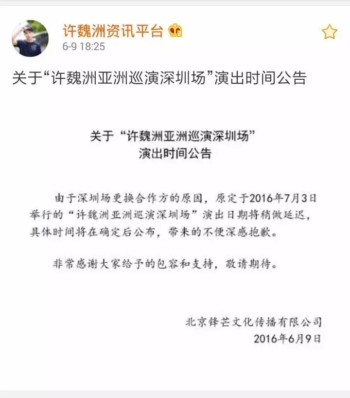 今日,许魏洲官方资讯平台发博,确定原定于7月3日的深圳签唱会因为更换合作方的原因延期,请大家耐心的等待,相信洲喵会带来更加精彩的演出!