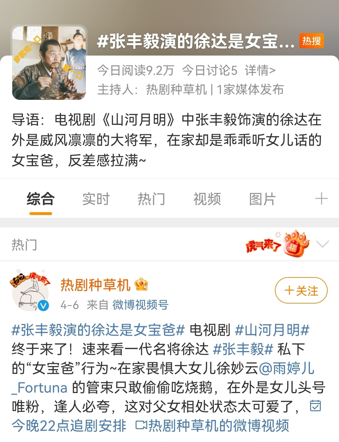 历史大剧《山河月明》开播第一天,演员张丰毅就以“女宝爸”的身份,登上了微博热搜。