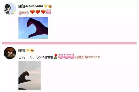 9月27日,陈晓发微博承认与陈妍希恋爱,称:“总有一天,你会跟我姓。”并配图用手比心。随后,陈妍希也发微博同样配图用手比另一半心,二人的手势凑在一起,就是一个完整的心形,网友笑称要被这样秀恩爱的方式给甜死……不少网友在他们微博下面送上祝福:“终于可以大方秀恩爱了吗?”