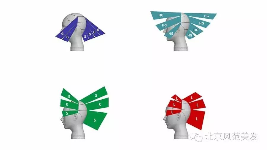 HG 层次 High graduation: 中低角度提取发片修剪,上侧头发单位长度大于下侧,层次差适中。