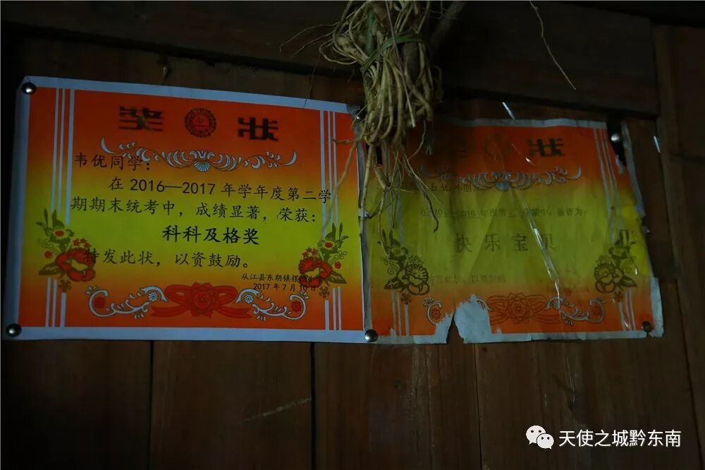 韦老勇三姐弟都很争气,学习成绩很好,家里挂满了各种奖状。