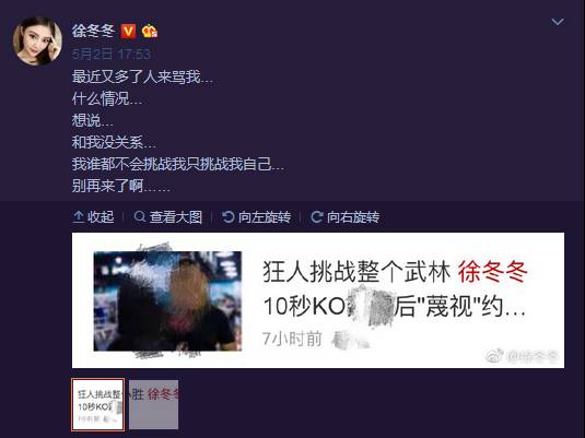 当然徐冬冬也没少被黑,明明是拳击高手徐晓东挑战太极,某些媒体就非要弄成徐冬冬挑战整个武林,对于这样的黑子我只想问,徐冬冬好好的明星不做,什么时候转行做江湖骗子了?