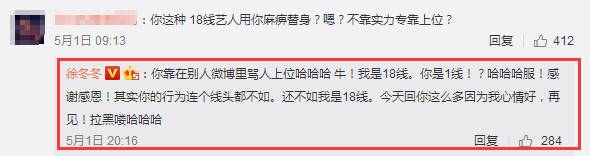 徐冬冬当然也不会示弱,反击回应黑粉仿佛成为了一种日常,大嫂徐冬冬的回复:“我是18线,你是1线,而你这个1线乱骂人还不如我这个18线”
