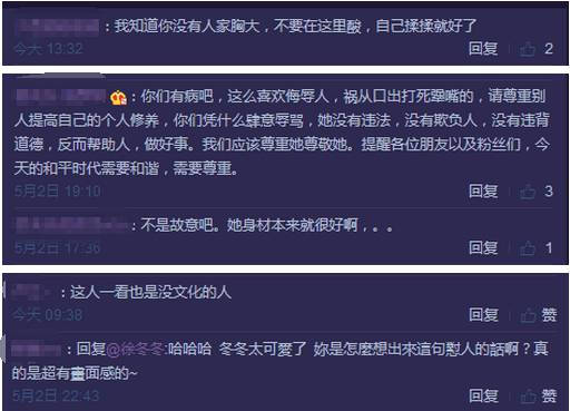 这次不仅徐冬冬自己犀利的反击了这些黑粉,还有一堆真爱帮着徐冬冬说话,说真的,这么耿直不做作招人喜欢胸大身材好的女明星我还是第一次见呢!