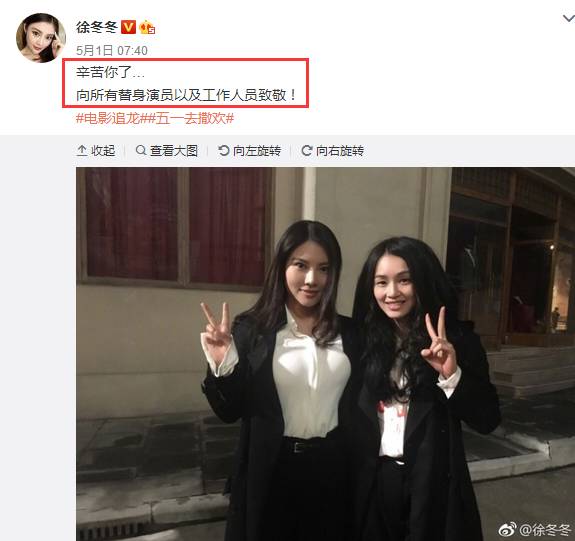 近日她还在微博上公开了自己和替身的合照,并且还配文:辛苦你了,向所有替身演员以及工作人员致敬!