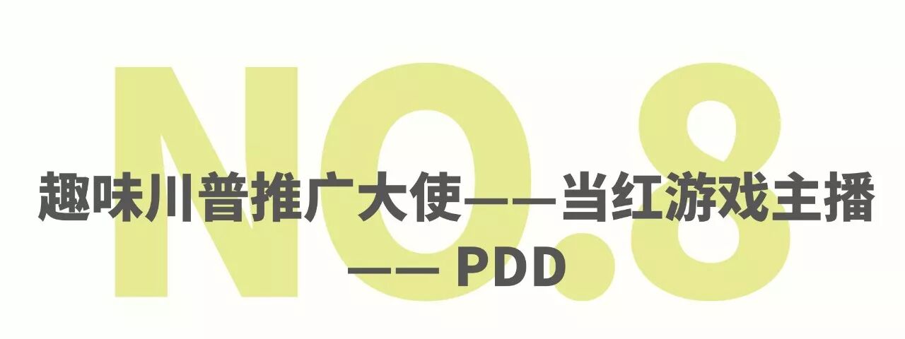 2017年,是PDD最活跃的一年,PDD在直播中的一切表现,正好符合成都人 “ 玩世不恭,语言嬉皮 ” 的特征。 “ 丫儿哟 ” “ 我是娇妹 ” 、 “ 香蕉船 ” 、 “ 蛇皮怪 ” 、 “ 猪皮恶霸 ” 等无数骚话,都将川普这种极富感染力语言推广到全国,影响了多达3000万的电竞粉丝。
