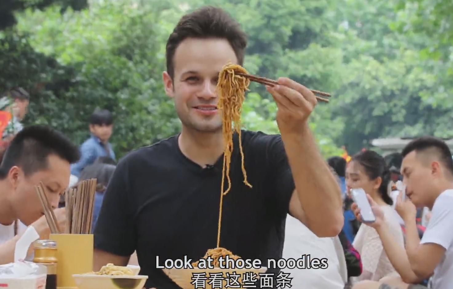 视频里,trevor james吃东西时,会经常用逗比的语言和夸张表情,表达 “ 成都民间美食 ” 的惊艳味道。这种味道,仿佛隔着屏幕,你就能闻道。