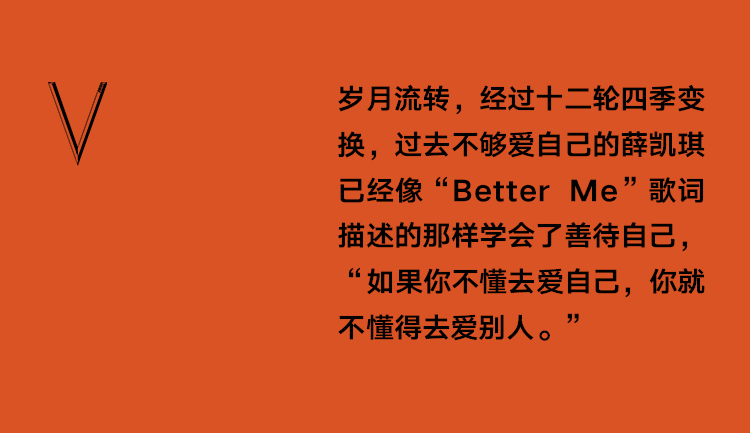 岁月流转,经过十二轮四季变换,过去不够爱自己的薛凯琪已经像“Better Me”歌词描述的那样学会了善待自己,“如果你不懂去爱自己,你就不懂得去爱别人。”