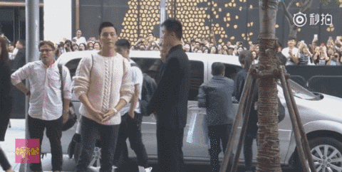 事实上,他也是这么做的。粉丝要合照,他担心粉丝不小心磕到头,还绅士的用手为粉丝挡了一下。