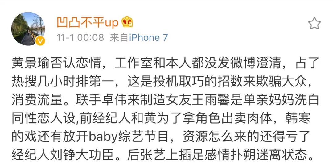 后来“凹凸不平up”发了一系列微博,中心思想都离不开“黄景瑜是个渣男”,但鉴于没有照片佐证,可信度还是要打个问号。
