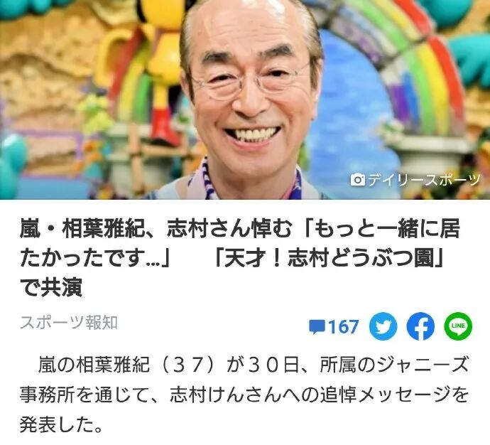 而自2004年开始,与志村健一起主持《天才志村动物园》有16年之久的相叶雅纪也是悲痛万分,通过事务所,对志村健的去世表示了哀悼。