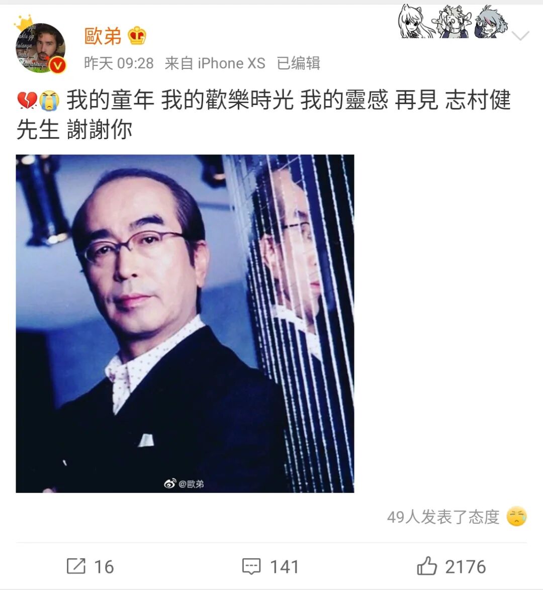 另外,志村健的节目《志村大爆炸》在中国台湾也热播过,台湾艺人欧弟也发表了对志村健的悼念。