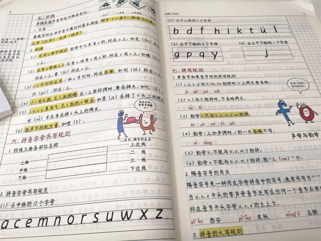 难点内容,漫画图解,理解更轻松,比如:解释拼音中“i 和u”的音调标号,iu并列时,调号标在后。