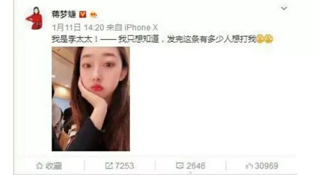 昨天,蒋梦婕发微博称:我是李太太,——我只想知道,发完这条有多少人想打我!并配上一张自拍照,不得不说,还是挺美的!