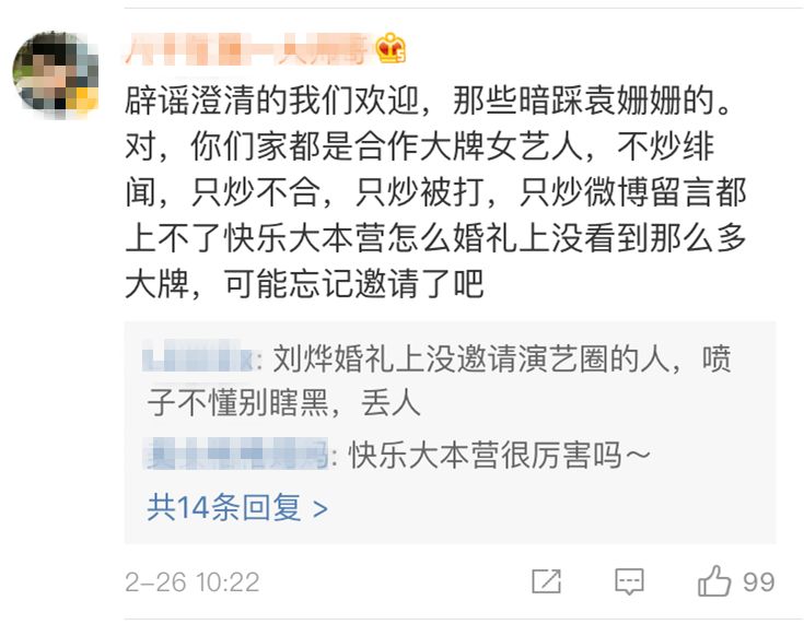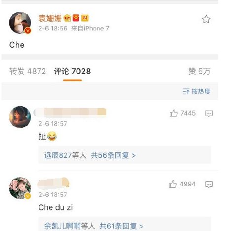 袁姗姗当时发了一条微博“che”,出面澄清。