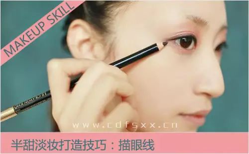 半甜淡妆要点:打造林心如式知性半甜淡妆,在眼妆方面,首先用珠光色的眼影打底,再用棕色的眼影晕染上眼窝和卧蚕位置,最后描绘黑色的粗眼线;唇妆则采用当下女性常用的浅红色。