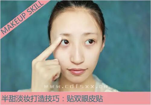 化妆技巧2:在眼窝中间位置贴上双眼皮贴,用手指指腹轻轻按压。