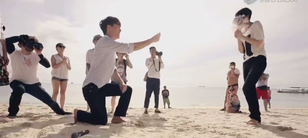 求婚在一片沙滩上,李承铉和戚薇穿着随意,戚薇还留着奇怪的短发,李承铉用蹩脚的中文求婚,戚薇哽咽着说了一句“你好烦啊”,弹幕飘过一句:戚哥第一次这么母。