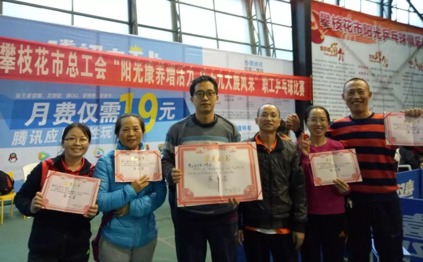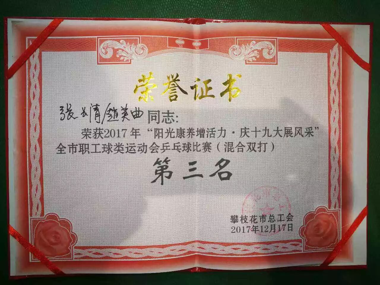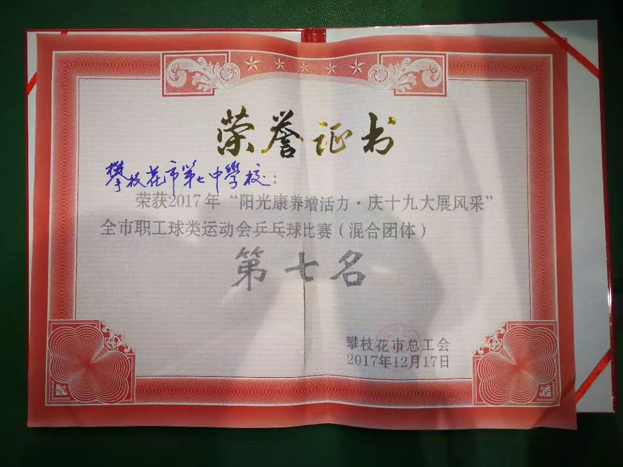 12月17日,由市总工会主办的攀枝花市2017年“阳光康养增活力 庆十九大展风采”职工球类运动会乒乓球比赛在市奥林匹克中心落下帷幕,我校教师乒乓球队从全市21支代表队中脱颖而出,谢景屏、黄玲老师荣获女双第一名,张长清、赵英曲老师荣获混双第三名。