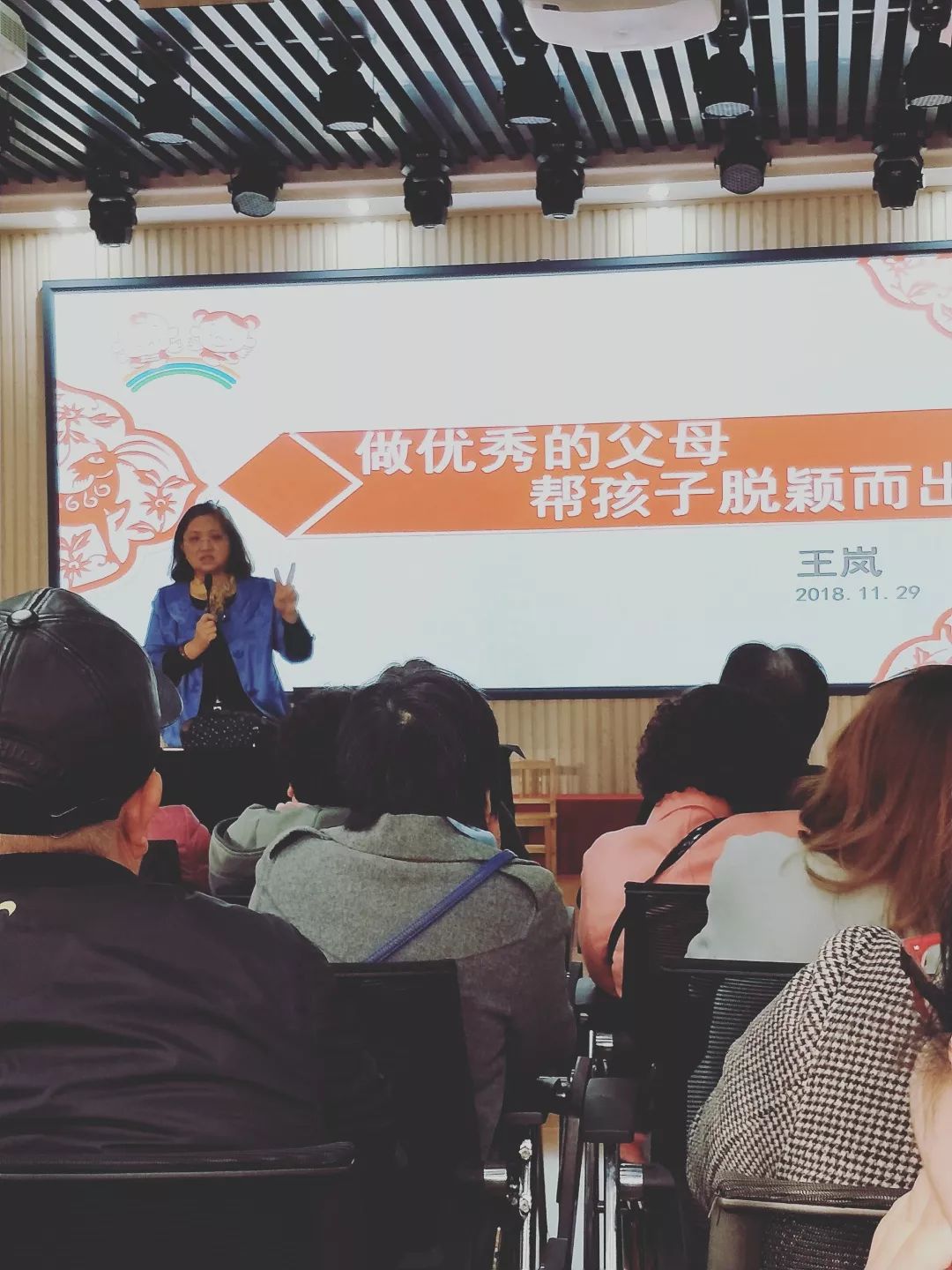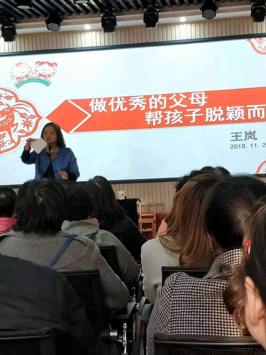 11月29日下午,我园有幸邀请到中国关心下一代工作委员会儿童发展研究中心课题组专家;全国家庭教育指导师;ACI注册国际心理咨询师——王岚老师,为我们小班的家长做了主题为《做优秀父母,帮助孩子脱颖而出》的讲座。