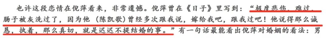 和陈凯歌同居了几年,却竹篮打水一场空,被陈红截了胡。所以倪萍在《日子》里也写到,这是一段“失去自我、没有自尊”的日子。