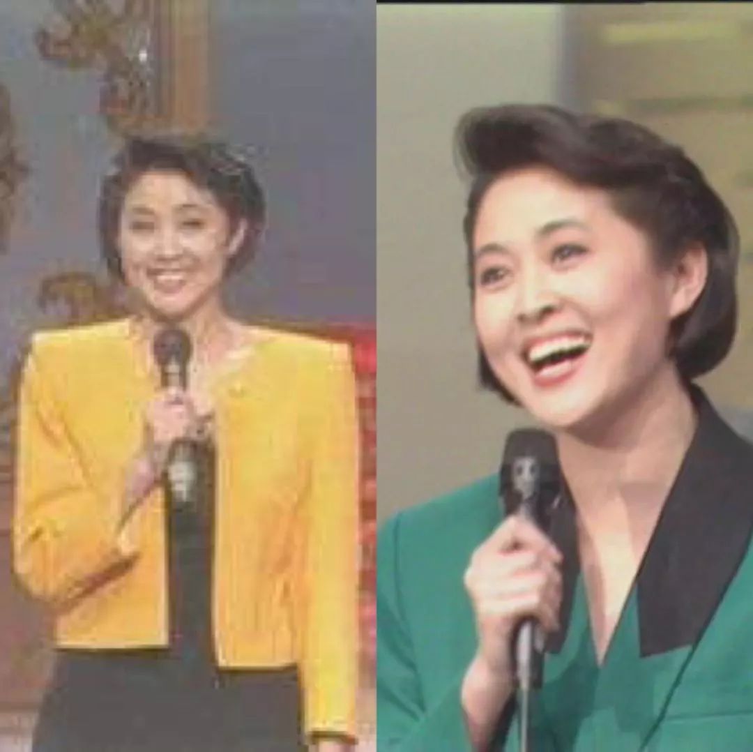 ▲左:1990年《综艺大观》;右:1991年春晚。这种短发此后再也没有出现过。倪萍的造型师邵京京曾说,倪萍想换发型,但全中国人民都不同意。