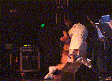 走下舞台的时候,不小心被音响绊倒,整个人重重摔在了地上,还是面部着地。