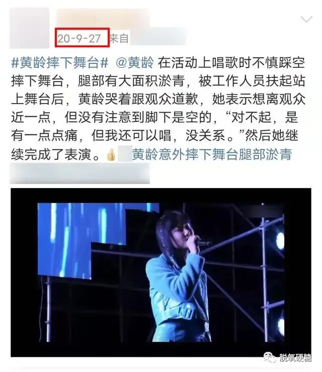 黄龄早前参加某户外音乐节的演出,整个人不小心踩空,直接掉下了舞台。