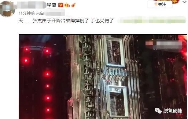 据爆料显示,张杰本来是在一个吊起的平台上面唱歌,但是平台由于故障,变得比较倾斜了。