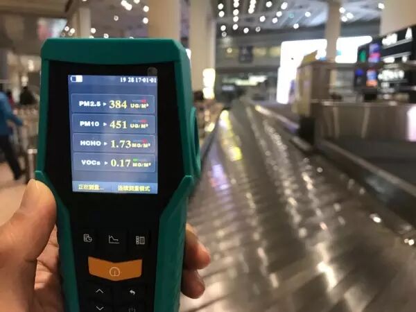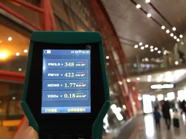 这次的检测,机场室内空气质量,明显优于室外。但这真不值得高兴,因为数据依然很高。