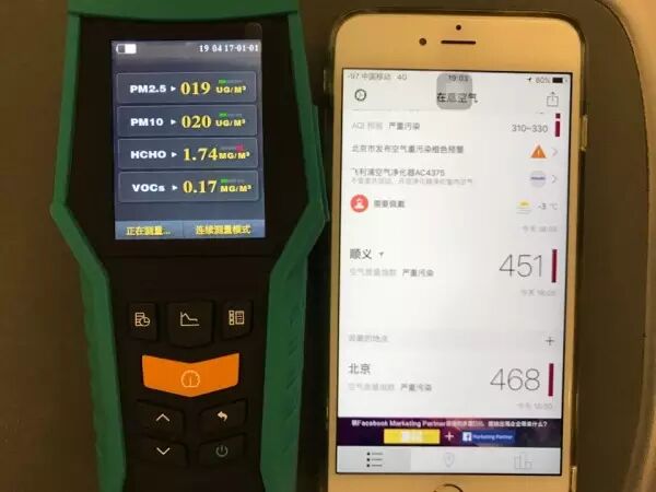 【图1】飞机降落停稳后,机舱内的数据和某app公布的附近地区数据(甲醛数据请忽略,我之前没有做甲醛指数的归零操作,以下同)。飞机在飞行途中的数据更低,接近于零,我分析原因如下:1.飞机自身的空气过滤系统可以过滤大部分PM2.5-10的杂质;2.飞机是在雾霾层之上平飞的,即便与机外空气交换,也只是温度调控和增加含氧量的问题。但是我不能打开手机拍照,所以没有照片↓↓