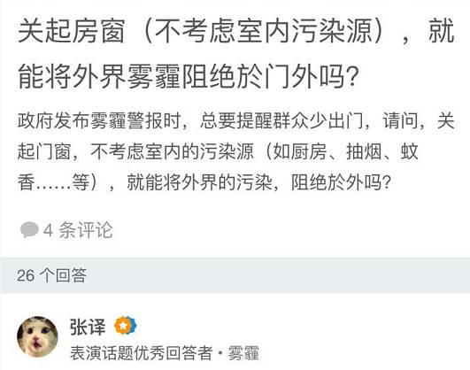 近日,演员张译在知乎网站上回答了一个关于雾霾的问题。有网友发问称“关起房窗(不考虑室内污染源),就能将外界雾霾阻绝于门外吗?”作为表演话题优秀回答者的张译,这次也关注了这个民生问题。他通过实验给出了回答,论证了“汽车在行驶过程中,在通风内循环的条件下,空气质量明显高于外循环的事实”,而在其他室内空间,雾霾浓度并不会好于室外。张译还提醒广大网友,在雾霾天气,开车或者乘车时,尽量将通风变为内循环,还呼吁大家要记得戴口罩出门,减少户外运动。
