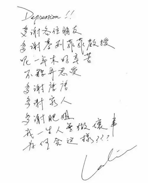 “Depression,多谢各位朋友,多谢麦列菲菲教授。呢一年来很辛苦,不能再忍受,多谢唐先生,多谢家人,多谢肥姐。我一生没做坏事,为何这样?”