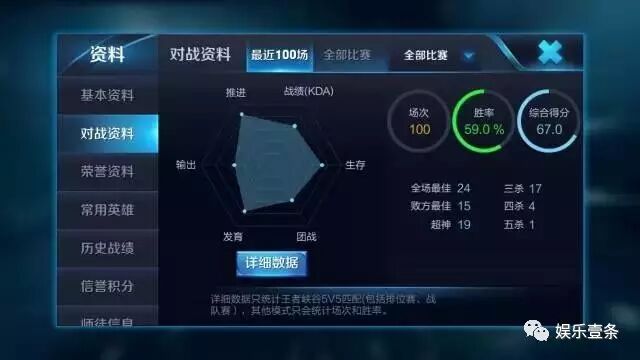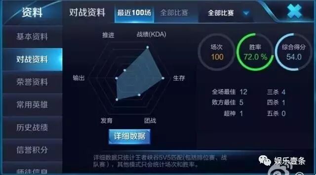 可以看到杨幂在推进,输出,发育和团战的得分都较低,只有生存和战绩很好,因为生存好意味着死得少,死得少自然KDA就高。但是,刚才看到杨幂的常用英雄可全是输出型英雄,输出评分却如此低,说明杨幂可能玩得并不是特别好。