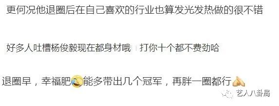 虽然已经不在圈里混了,但杨俊毅有自己发光发热的圈子,不少网友调侃他这是幸福肥,能多带出几个冠军再胖一圈都行。