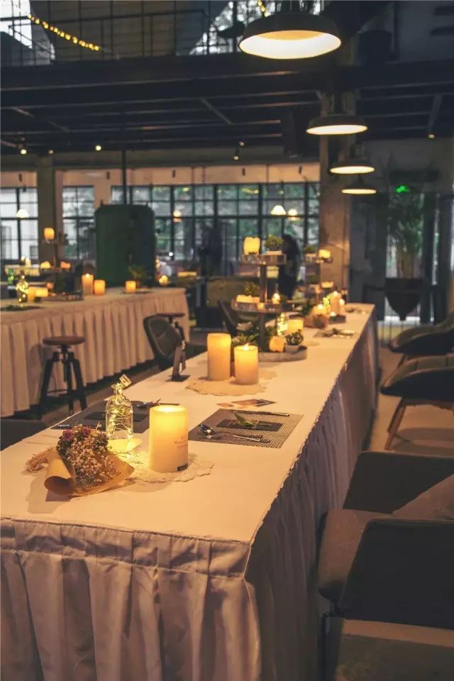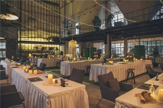 桌椅被摆成长条状,上面摆满了鲜花与蜡烛,所有鲜明的浓烈的时尚的气息,让这个几十年的老厂房又瞬间时髦起来。