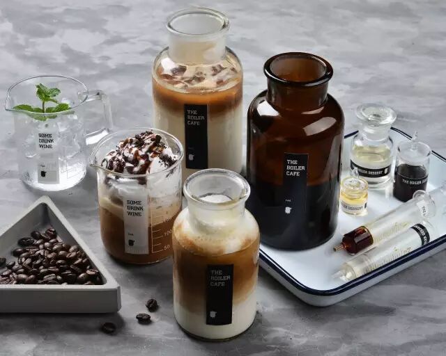 这里所有的盛餐器皿都是真正的实验室工具,量杯、烧杯、试管、针管......是分别用来盛装牛奶、布丁、冰淇凌、糖......