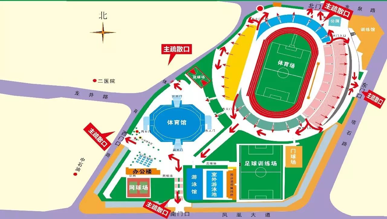 ①持内场票区的观众,从体育中心南门口(体育中心南侧梯步)、西门口(中石油侧门北侧体育路段)、体育中心西侧门口(南昕酒店南侧体育路段)经体育场西大门、南大门进入内场;从体育中心东门口(体育中心东大门下入口)经体育场东大门、南大门进入内场。