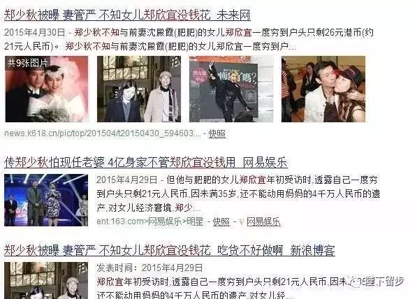 每次采访时媒体总会问到郑欣宜跟父亲郑少秋是否有联系?郑欣宜却回答联系不上,而问到父亲时,郑少秋确说郑欣宜忙着谈恋爱没有时间见面,在最落魄的时候郑欣宜身上只有一百块钱,可以说是最可怜的星二代了。