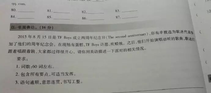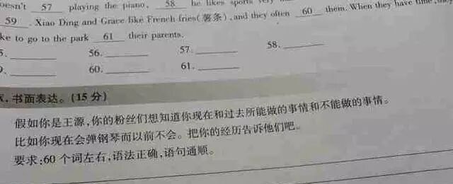 还有一些考题让学生“变”成了TFBOYS组合成员。有一道英语表达题的题目就是:“假如你是王源,你的粉丝们想知道现在和过去能做的事情和不能做的事情。比如你现在会弹钢琴而以前不会。把你的经历告诉他们吧。”