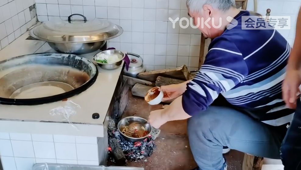 厨房的画风也差不多,本山大叔坐在大锅旁边,不断往灶坑里填着木柴。