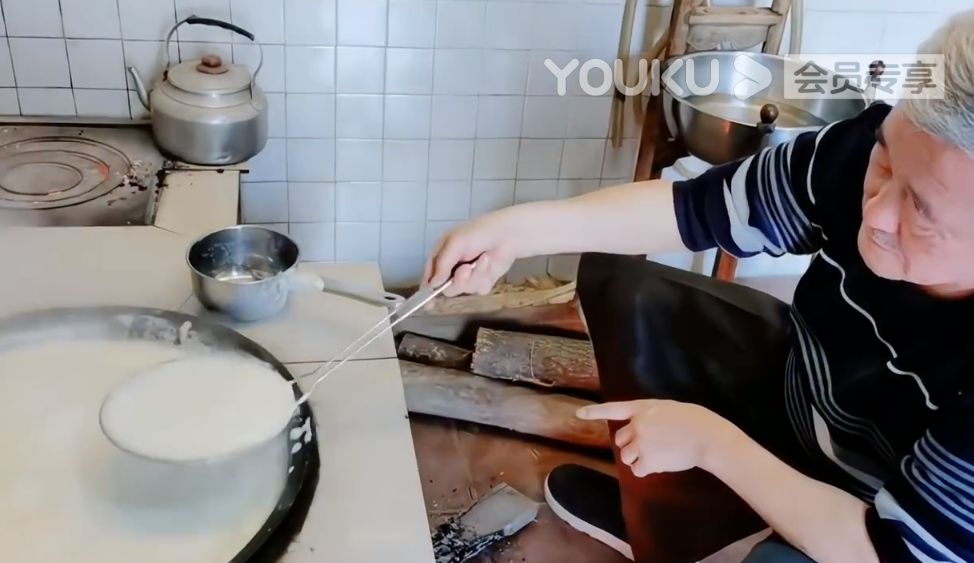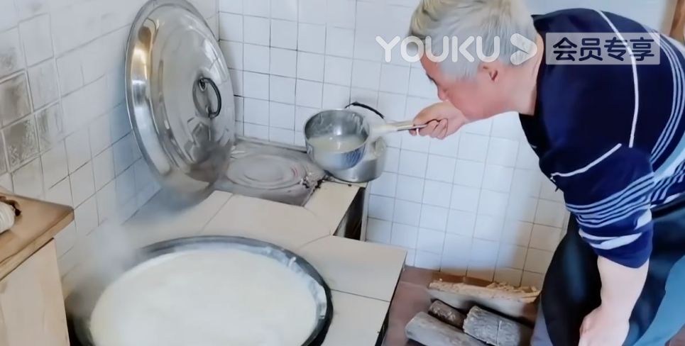 还在线传授起了技巧,大锅里的白色凝固液体起码要翻开三次才行,要时刻注意火候不能太大。