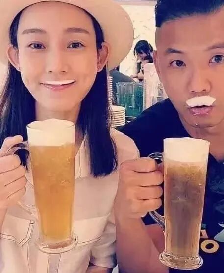 滴酒不沾的他,还喜欢把啤酒泡抹在胡子上照相,当然范范也可以说那是奶盖。